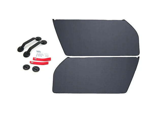 Das RS-Türverkleidungs-Kit wird als vollständiger Satz für beide Fahrzeugseiten geliefert und enthält sämtliche Befestigungsteile sowie Türgriffe. Die Ausführung in schwarzem Vinyl/Kunstleder verleiht dem Innenraum einen klassischen, motorsportorientierten Look. Schwarze Zugschlaufen ersetzen konventionelle Türöffner und betonen den puristischen RS-Stil. Geeignet für Fahrzeuge mit Links- oder Rechtslenkung.