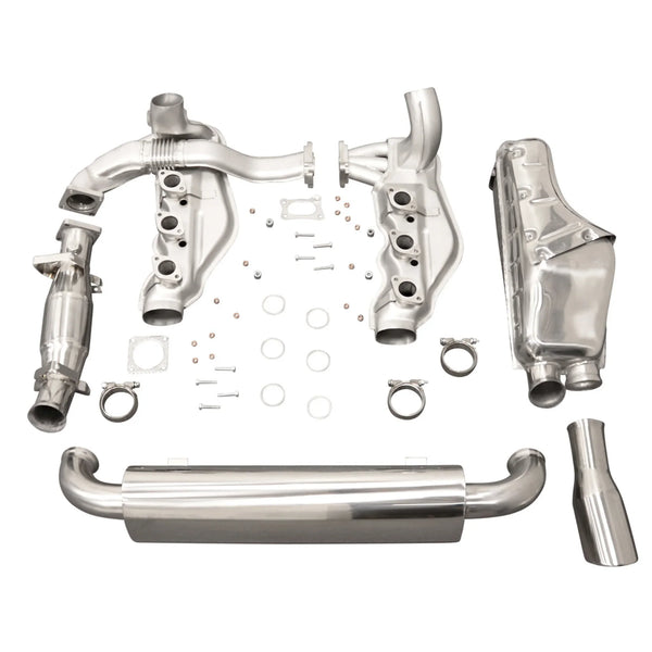 Komplette Edelstahl-Abgasanlage für Porsche 964 Modelle (nicht Turbo), bestehend aus Standard-Katalysator, Sport-Endschalldämpfer und Einzel-Endrohr. TÜV-Gutachten für den Endschalldämpfer enthalten.