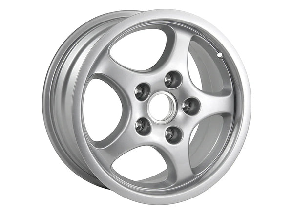 Original Porsche 16-Zoll-Leichtmetallrad für die Hinterachse im Silbermetallic-Finish. Passend für Porsche 964 Carrera (1992–1994) und Porsche 968 (1992–1995).