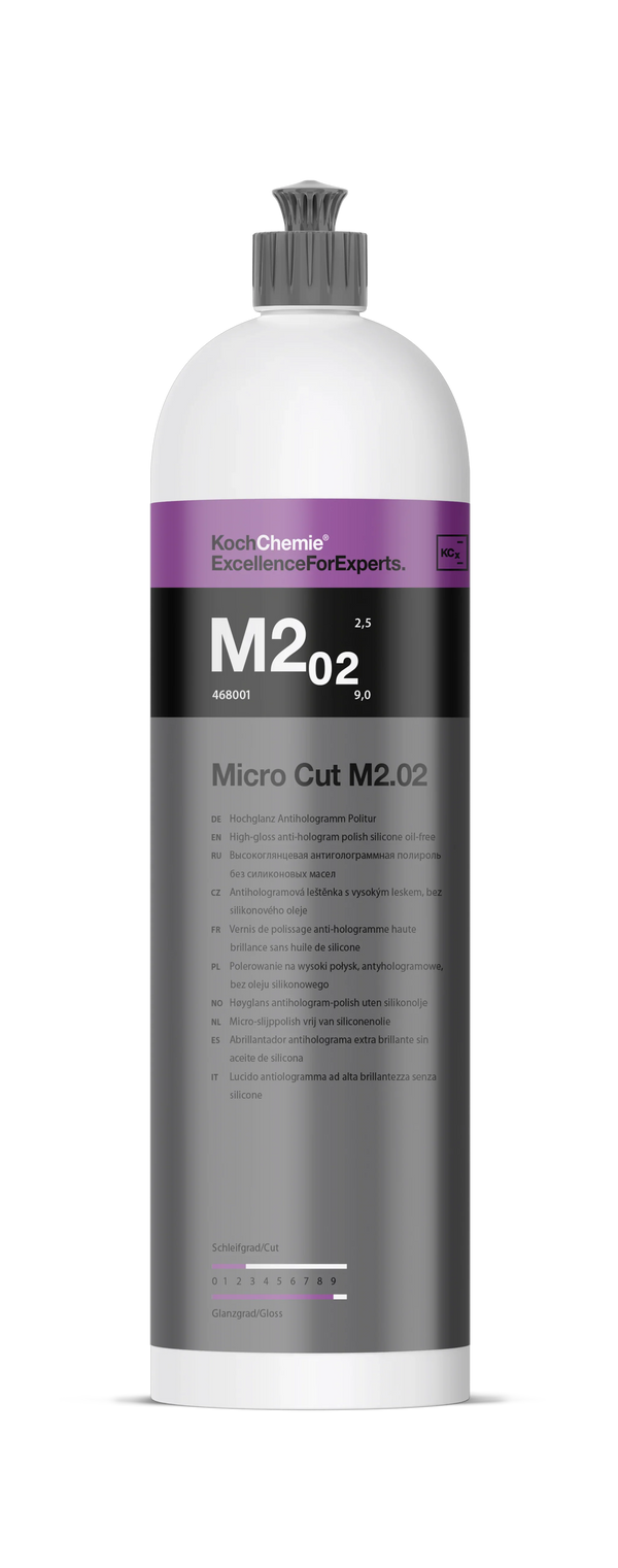 Micro Cut M2.02 ist ein Maschinen-Micropoliermittel der neuesten Generation zur dauerhaften Entfernung von Polierschleiern, Hologrammen, feinen Kratzern und Anschliffen ab 4.000er Körnung auf allen Lacksystemen, einschließlich kratzfester Lacke. Hoch spezialisierte, extrem homogene Schleifkörper erzeugen selbst auf dunklen und empfindlichen Farbtönen unter extremen Lichtbedingungen ein brillantes und dauerhaftes Hochglanzfinish. Hologramme und feine Kratzer werden mechanisch eliminiert. Micro Cut M2.02 ist ergiebig, gut polierbar und rückstandslos entfernbar. Schleifgrad: 2,5 – Glanzgrad: 9,0.