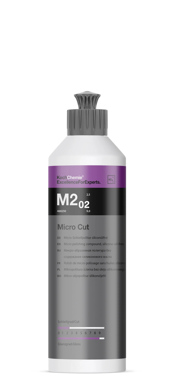 Micro Cut M2.02 ist ein Maschinen-Micropoliermittel der neuesten Generation zur dauerhaften Entfernung von Polierschleiern, Hologrammen, feinen Kratzern und Anschliffen ab 4.000er Körnung auf allen Lacksystemen, einschließlich kratzfester Lacke. Hoch spezialisierte, extrem homogene Schleifkörper erzeugen selbst auf dunklen und empfindlichen Farbtönen unter extremen Lichtbedingungen ein brillantes und dauerhaftes Hochglanzfinish. Hologramme und feine Kratzer werden mechanisch eliminiert. Micro Cut M2.02 ist ergiebig, gut polierbar und rückstandslos entfernbar. Schleifgrad: 2,5 – Glanzgrad: 9,0.