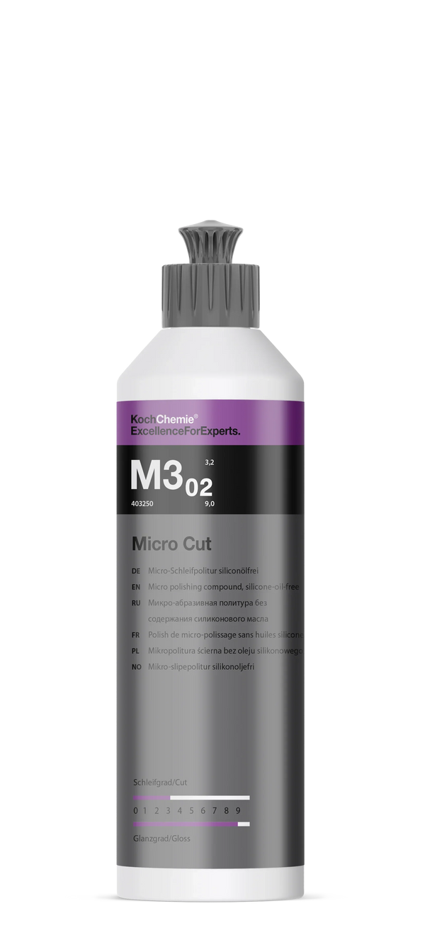 Micro Cut M3.02 ist ein Maschinen-Micropoliermittel der neuesten Generation zur dauerhaften Entfernung von Polierschleiern, Hologrammen, feinen Kratzern und Anschliffen bis 3.000er Körnung auf allen Lacksystemen, einschließlich kratzfester Lacke. Hoch spezialisierte, extrem homogene Schleifkörper erzeugen selbst auf dunklen und empfindlichen Farbtönen unter extremen Lichtbedingungen ein brillantes und dauerhaftes Hochglanzfinish. Hologramme und feine Kratzer werden mechanisch beseitigt und nicht abgedeckt. Micro Cut M3.02 ist ergiebig, gut polierbar und rückstandslos entfernbar. Schleifgrad: 3,2 – Glanzgrad: 9,0.