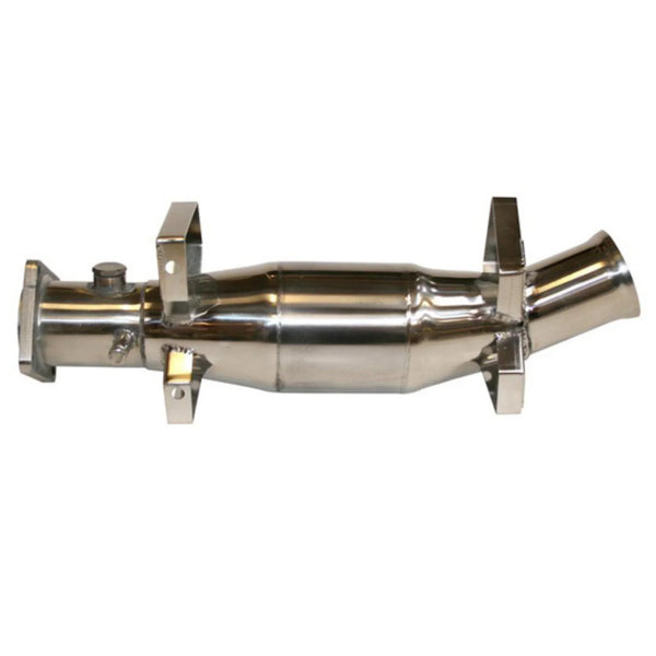 Sportkatalysator aus poliertem Edelstahl mit 100-Zellen-Keramikeinsatz sowie integrierter Lambdasondenbohrung und Verschluss. Passend für Porsche 964 C2 und C4.